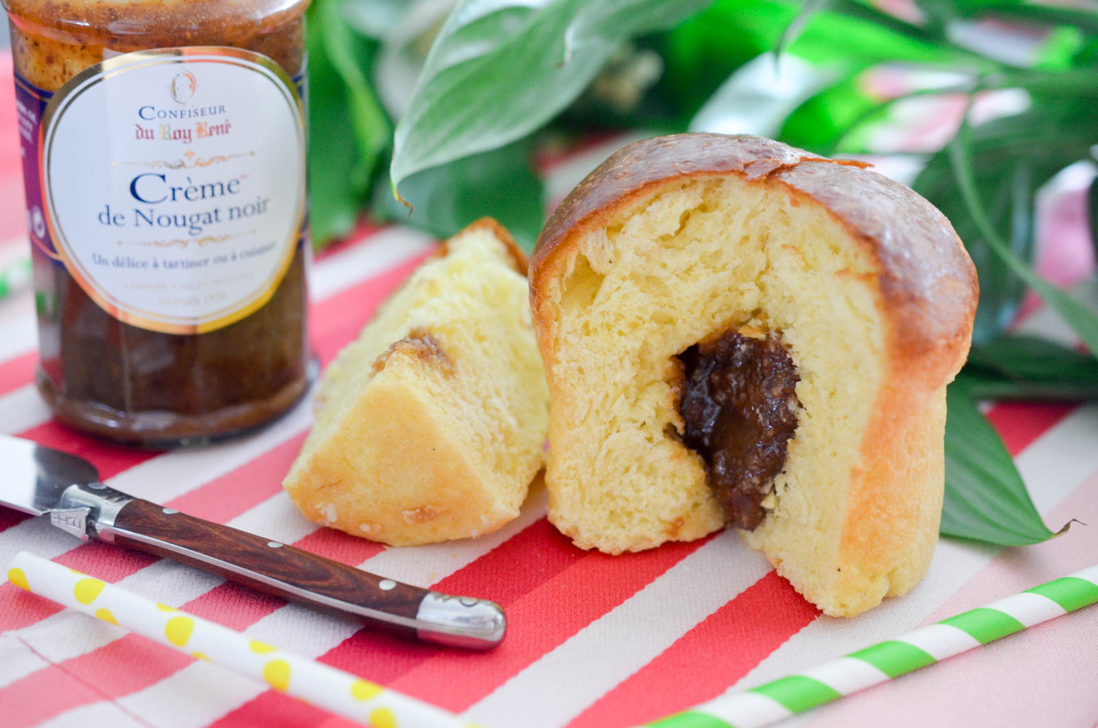 Maintenant que c’est l’été, et peut être bientôt les vacances pour certains, on peut se permettre de prendre le temps de prendre le temps… pour confectionner ses propres brioches ! C’est tellement bon et finalement très simple, il faut juste savoir patienter un peu. Ici, je l’ai fourré à la crème de Nougat Noir, un délice que j’ai trouvé chez le Confiseur du Roy René.