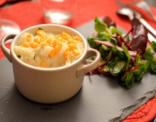C’est au programme: Mini cocottes de canard pommes, miel, à la purée de céleri, façon Parmentier, accompagnées de sa salade de jeunes pousses