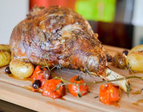C’est au programme: Agneau de Pâques citron origan et ses pommes grenailles rôties aux tomates cerises et aux olives noires