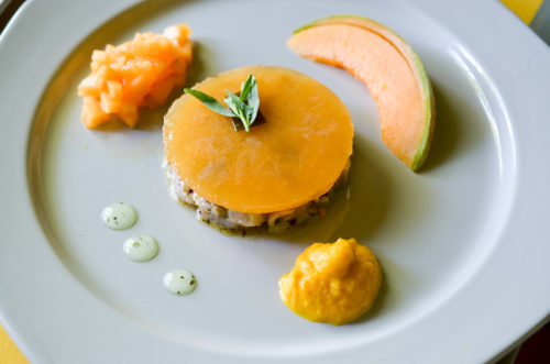 C’est au programme: Tartare de lieu aux agrumes et algues, sur lit de melon