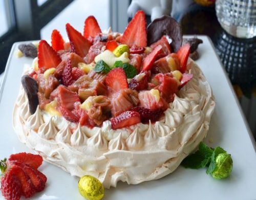 C’est au programme: Pavlova rhubarbe, fraises et son mousseux citron