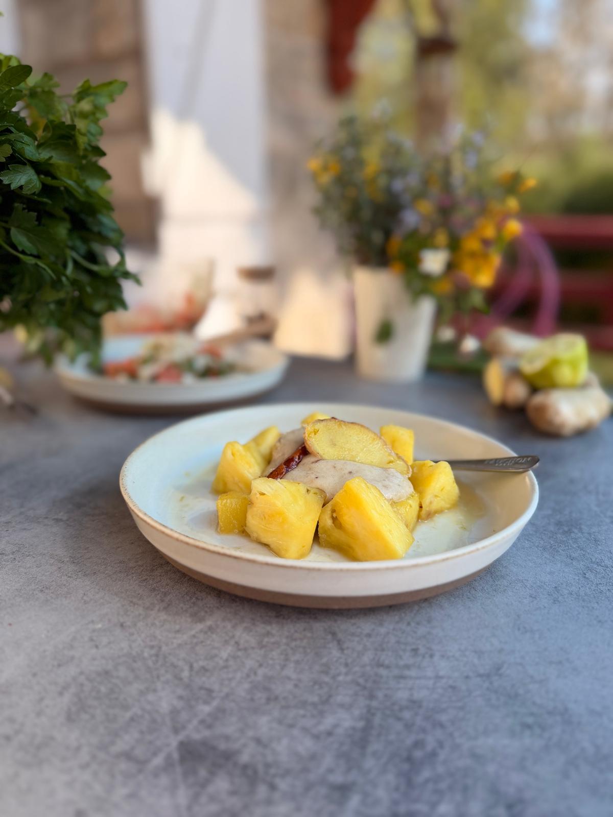L’ananas rôti est un dessert tout simple et léger, parfait pour finaliser un repas. Ici je le sers tiède avec une boule de sorbet banane maison, mais vous pouvez également le servir froid, tel quel pour rehausser les saveurs d’une salade de fruits.