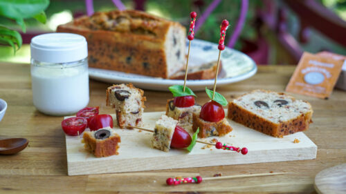 Côté ingrédients, c’est tout simple : des olives (vertes ou noires, ou un mélange), du thym, des tomates séchées et du parmesan. Il ne s’agit là que d’une idée, vous pouvez décliner avec ce que vous avez dans le placard (remplacer par exemple les olives par des dés de jambon, des fruits secs ou autre).