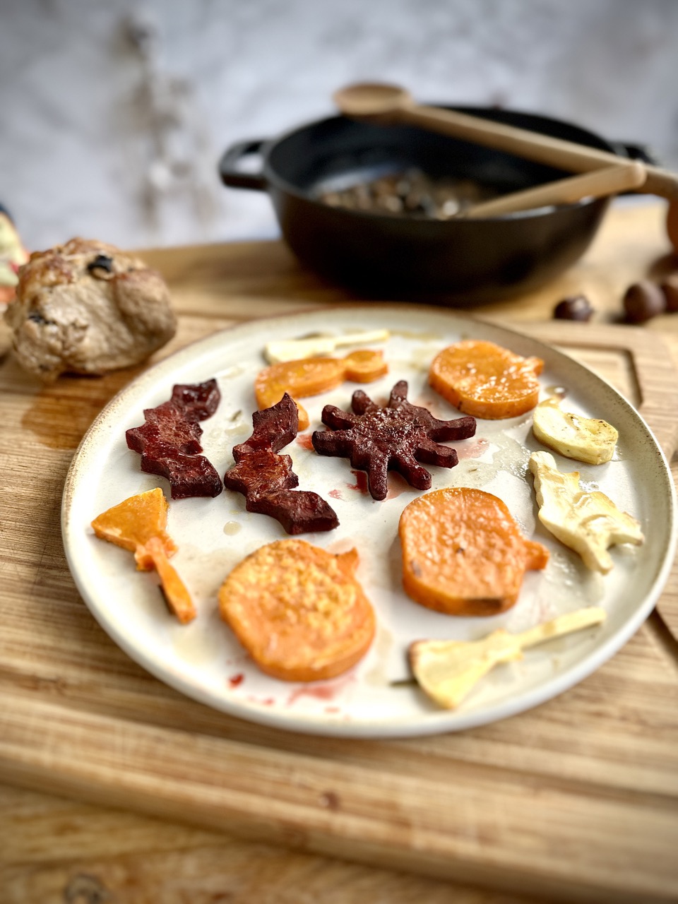 Voici une idée toute simple de légumes rôtis au four. L’originalité vient tout simplement de la découpe. J’ai utilisé ici des emporte-pièces, mais vous pouvez imprimer des patrons sur internet ou si vous vous sentez l’âme d’un artiste, les tailler directement au couteau.