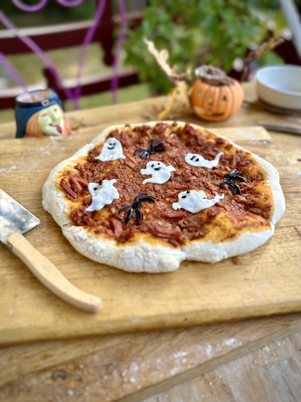 Cette pizza Halloween avec des petits fantômes est juste irrésistible et vraiment très facile à faire. Quoi de mieux que le plaisir de préparer soit-même une pizza maison ? Surtout quand elle est rigolote et que l’on peut la préparer en famille.