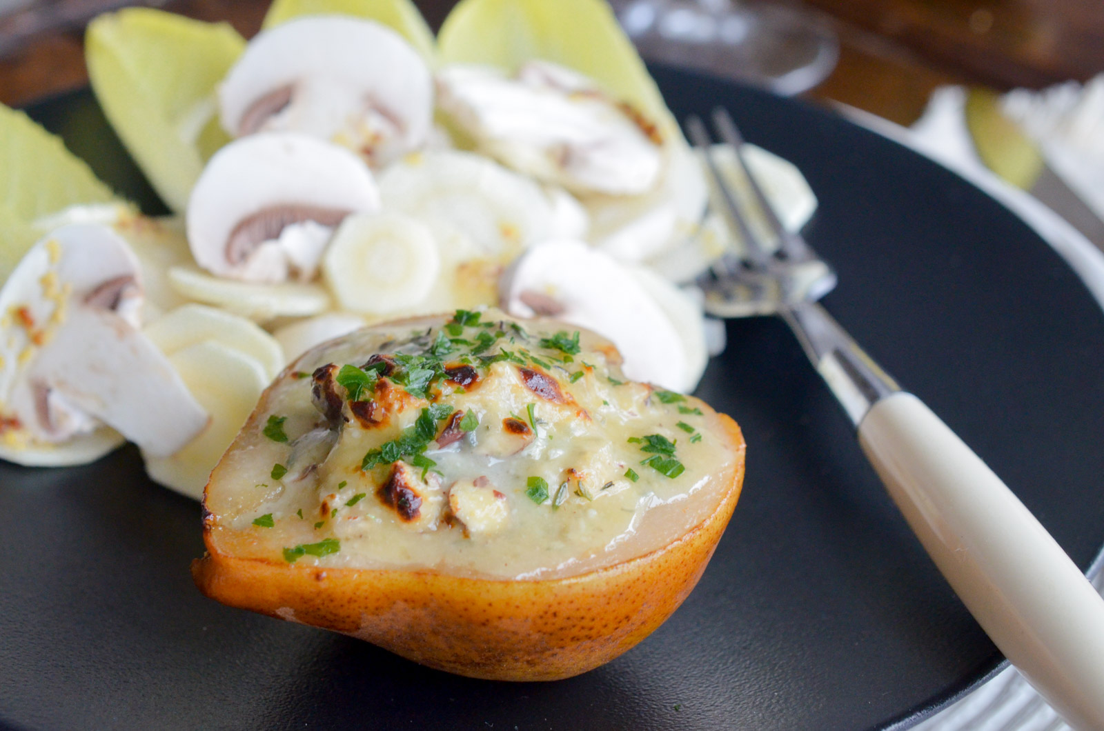 7. Lorsque les poires sont juste fondantes, placez-les sur une grille ou dans un plat supportant le grill du four. Garnissez de mélange au bleu et glissez au four 2 minutes, juste de quoi faire légèrement gratiner le fromage.