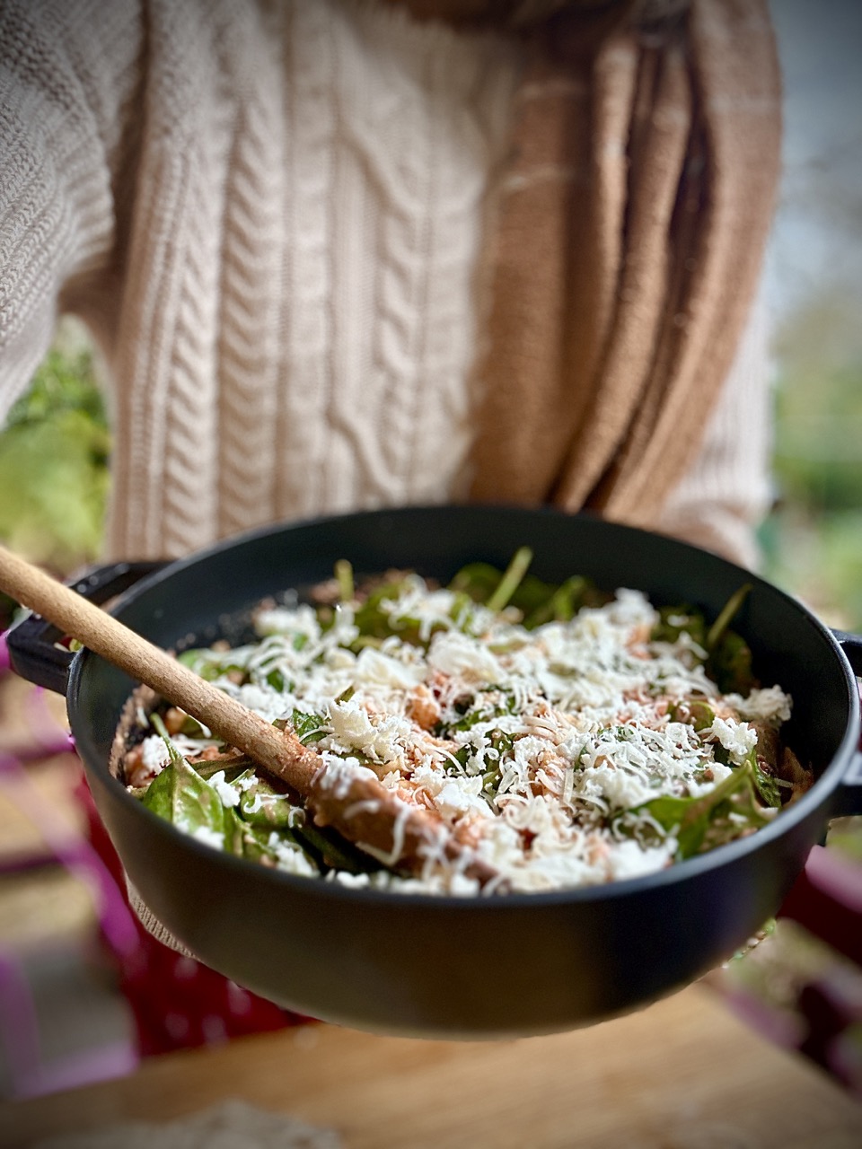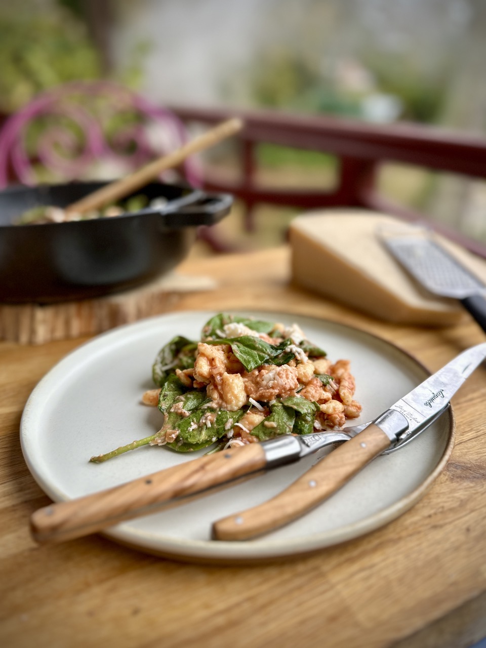 Les spaetzle sont des pâtes traditionnelles d’origine Alsacienne, qui accompagne généralement les plats en sauce, mais j’en ai fait ici un plat principal végétarien réconfortant et très gourmand, tout en étant assez digeste grâce à une sauce légère à la tomate et aux épinards.