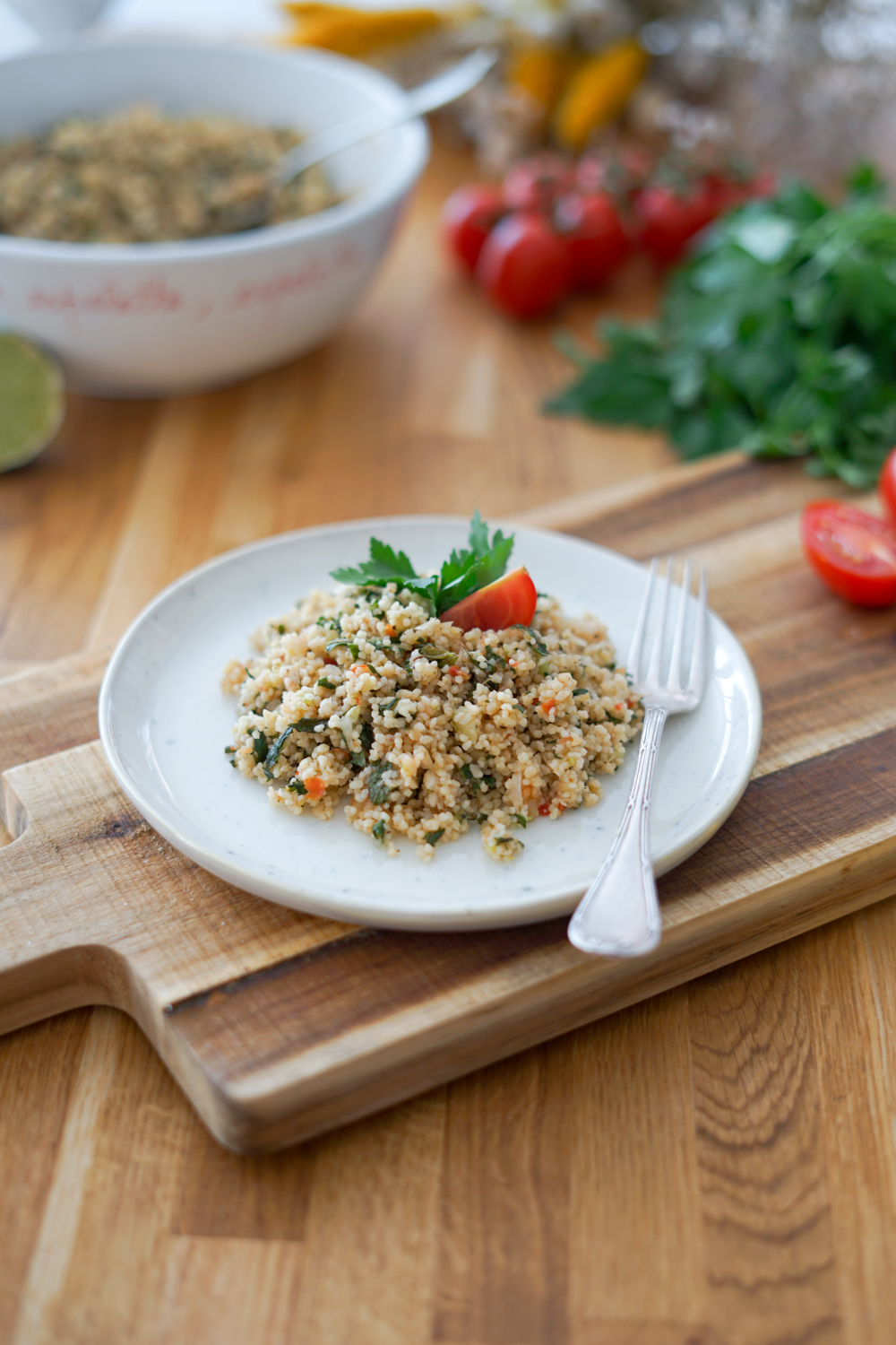 Je vous mets ici la recette de base du taboulé, mais n’hésitez pas à ajoutez les légumes de votre choix : poivrons, mais aussi raisins secs, amandes etc.