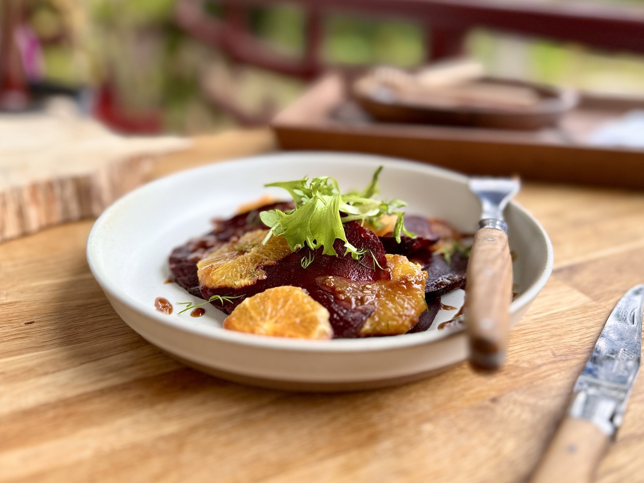 Carpaccio de betterave, mandarine et vinaigrette yuzu-miso