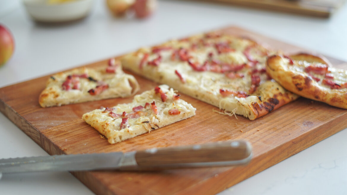 Côté garniture, celle que je préfère est sans nul doute la plus basique : crème, oignons, lardons. Mais vous pouvez bien sûr ajouter tous types de garnitures selon vos envies (et ce qu’il vous reste dans le frigo).
