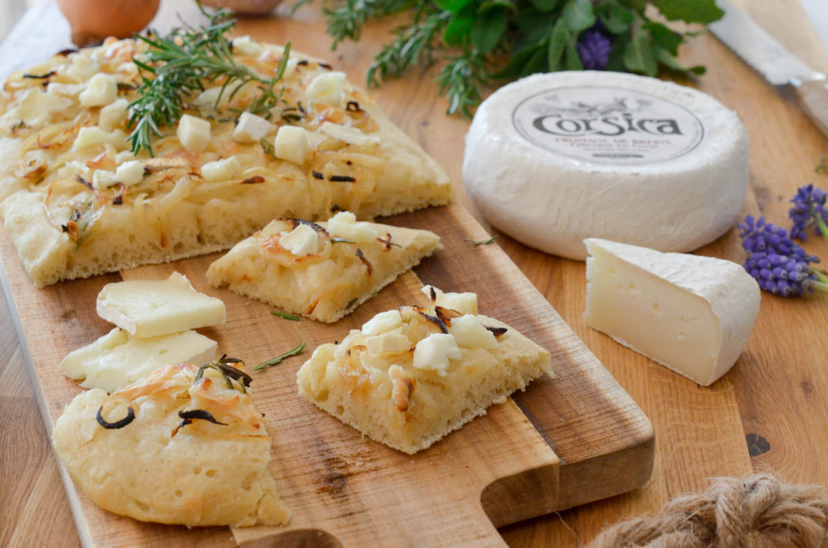 Connaissez-vous la focaccia ? Il s’agit d’un pain plat cuit au four, originaire d’Italie. C’est un peu la cousine de notre fougasse française. La mie est épaisse et moelleuse et on peut l’agrémenter de différents ingrédients, comme ici des oignons et du fromage Corse. Oui je sais, à l’approche des vacances, j’ai fait ici un gros mélange de tout ce que je préfère dans le sud : l’Italie, la Corse, la générosité :-)