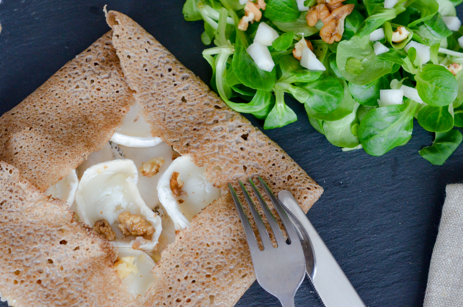 Aujourd’hui, c’est la chandeleur ! L’association chèvre – noix – miel est un grand classique que j’adore et dont on fond volontiers pour cette occasion. J’y ai ajouté quelques lamelles de poire et une pincée de thym pour encore plus de saveurs, le tout accompagné d’une belle salade de mâche pour en faire un repas complet.
