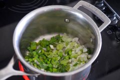 5. En attendant que les poivrons cuisent, coupez les oignons nouveaux et faites-les revenir dans une poêle avec un filet d’huile d’olive.