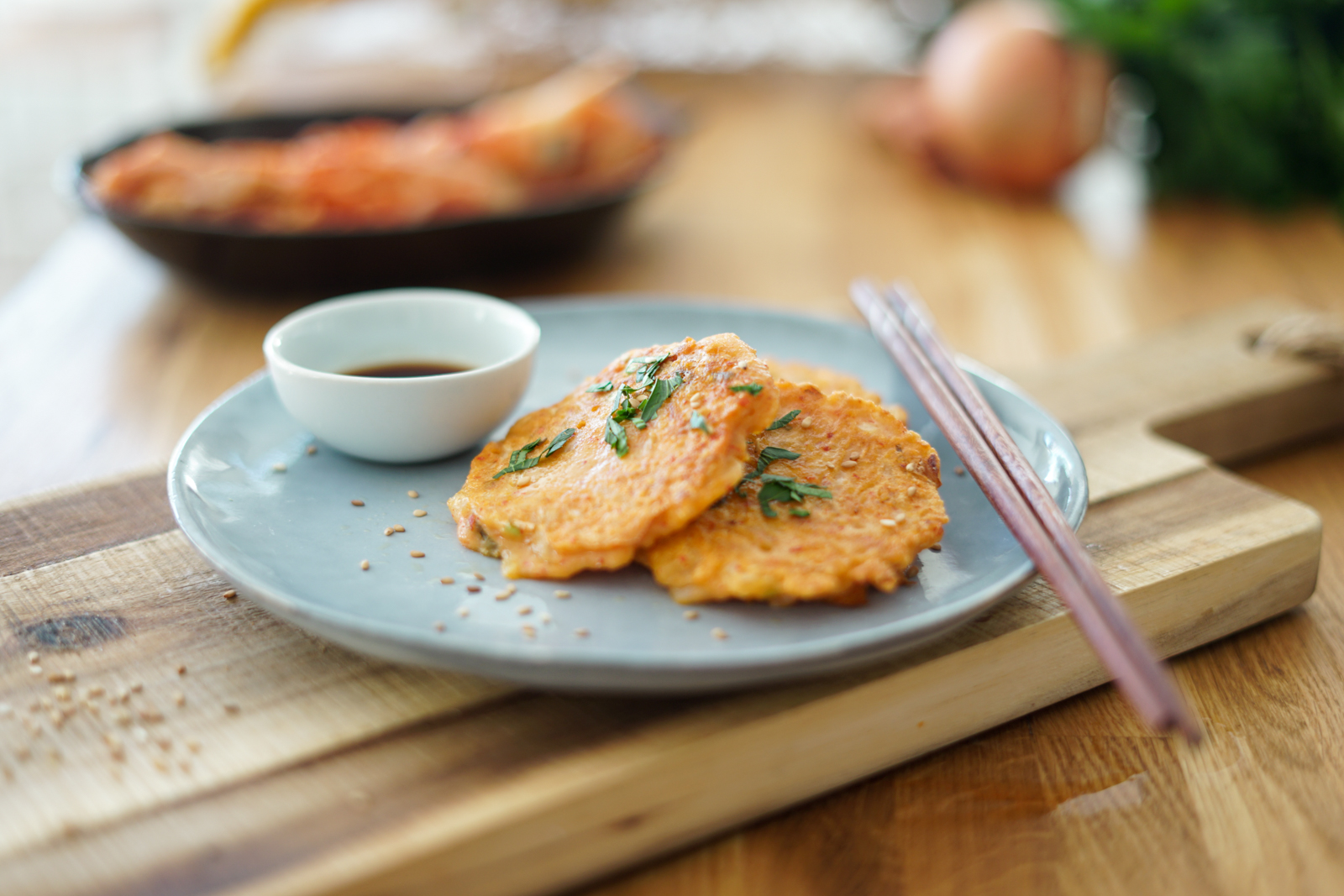 Connaissez-vous les pancakes coréens ? C’est délicieux, bien moelleux, elles sont ici aromatisées avec du kimchi. Le Kimchi est une recette de chou fermentée à la coréenne (on peut également trouver d’autres légumes façon kimchi type concombre etc). Il est considéré comme un superaliment, comme tous les aliments fermentés. Vous pouvez donc en user et en abuser.