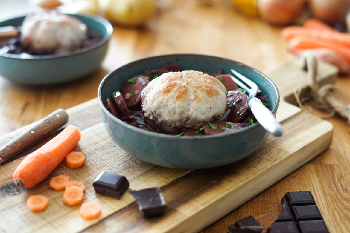 Ce qui est pratique, c’est que la recette ne nécessite que peu d’ingrédients et de préparation. La base est un peu comme un bourguignon ou un ragoût. J’ai simplement remplacé la viande traditionnelle contre des paupiettes de veau (merveilleusement moelleuses). Et la sauce au vin est légèrement réduite et additionnée de quelques carrés de chocolat bien noir, qui apporte à la fois rondeur en bouche et onctuosité à la sauce. Associé à des carottes, c’est juste parfait. Vous pouvez également compléter avec quelques pommes de terre ou des tagliatelles fraiches et l’affaire est dans le sac.