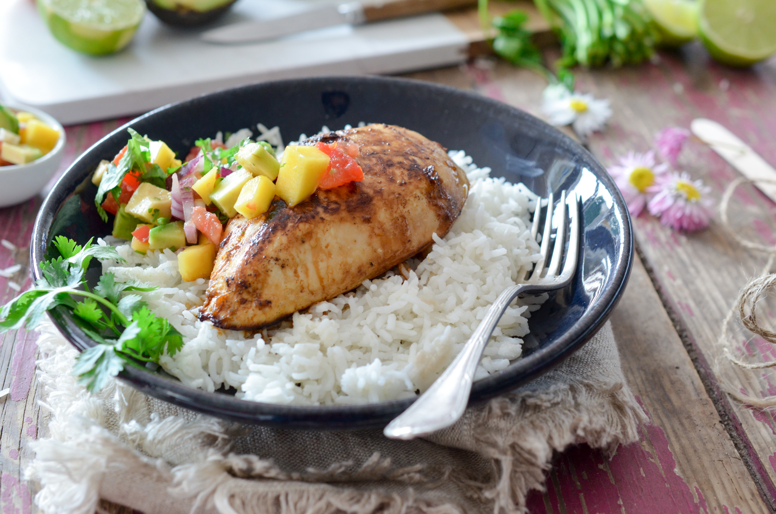 Il s’agit de filets de poulet marinés et juste grillés, bien tendres, et accompagnés d’une salsa à la mangue, le tout servi sur un lit de riz délicatement parfumé au citron vert… Alors, tentés ? ;-)