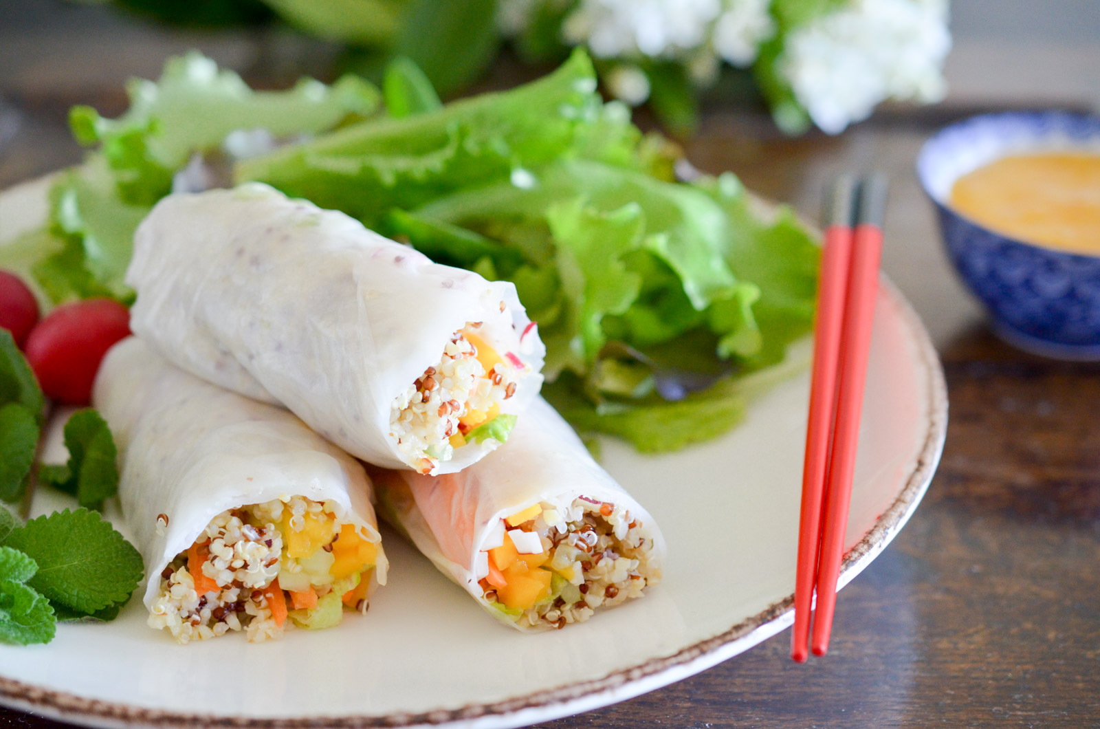 Une délicieuse recette de rouleaux de printemps sucrée salée, plein de légumes et pleins de bienfaits. Avec du quinoa, des amandes (en remplacement des cacahuètes classiques), de la menthe et une sauce pimentée à la mangue, faites votre cure de vitamines en quelques bouchées (très) colorées.