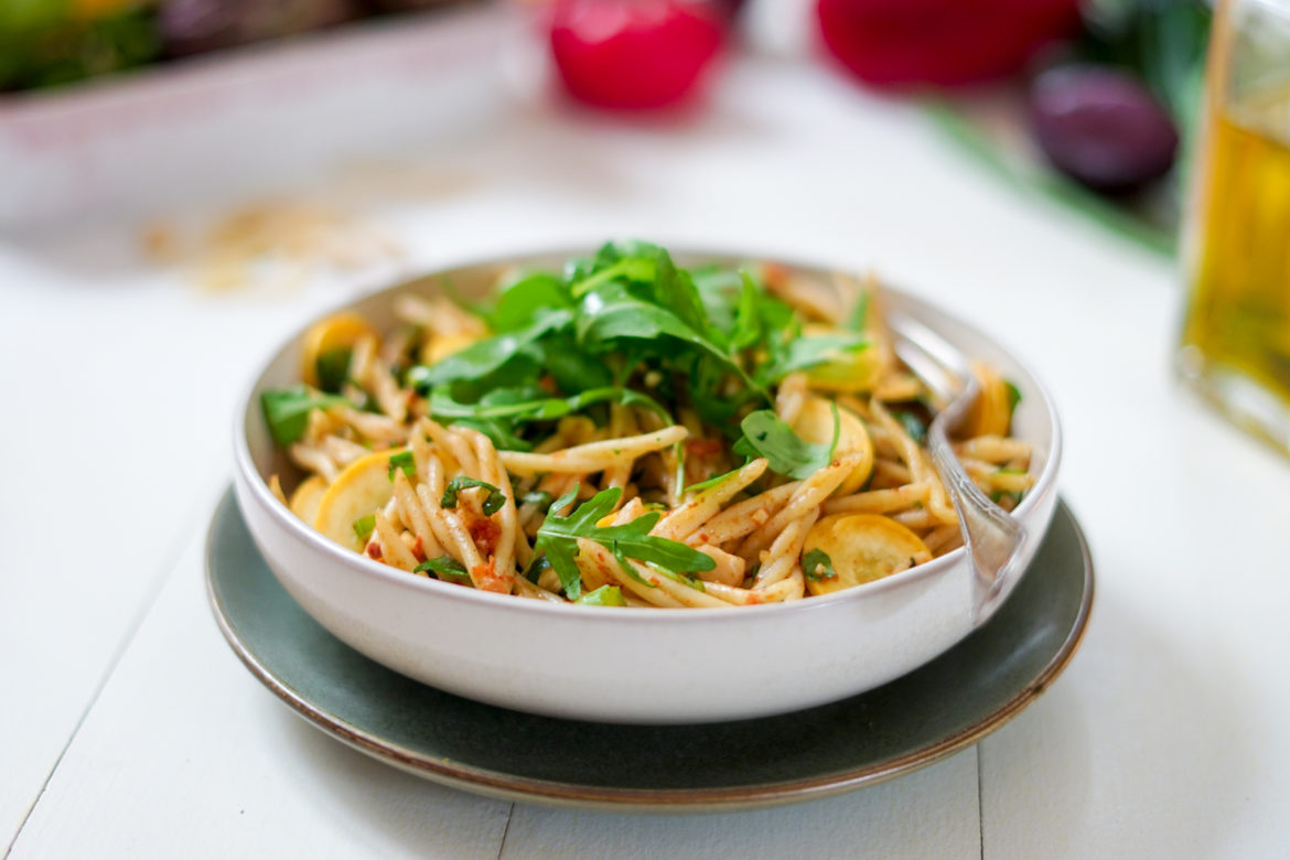 Voici une recette très simple et estivale de salade de pâtes au pesto de tomate séchée, avec une touche de courgette, d’herbes fraiches et un petit croquant amande et pignon de pin… un délice !