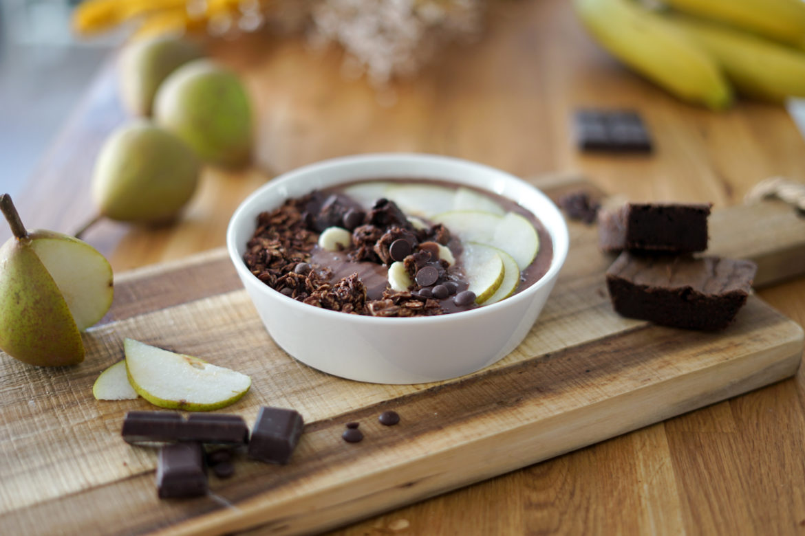 Alerte gourmandise ! Vous y croyez ça à un smoothie bowl aux brownie ? Oui, oui, c’est totalement indécent… mais c’est tellement bon ! J’ai préparé ici une base de smoothie bowl au chocolat très saine avec seulement des fruits, une touche de lait et de cacao. Après pour les toppings, je me suis un petit peu lâchée en mixant du granola croquant avec quelques brisures de brownies (maison ou pas, même si maison c’est encore meilleur, bien sûr).
