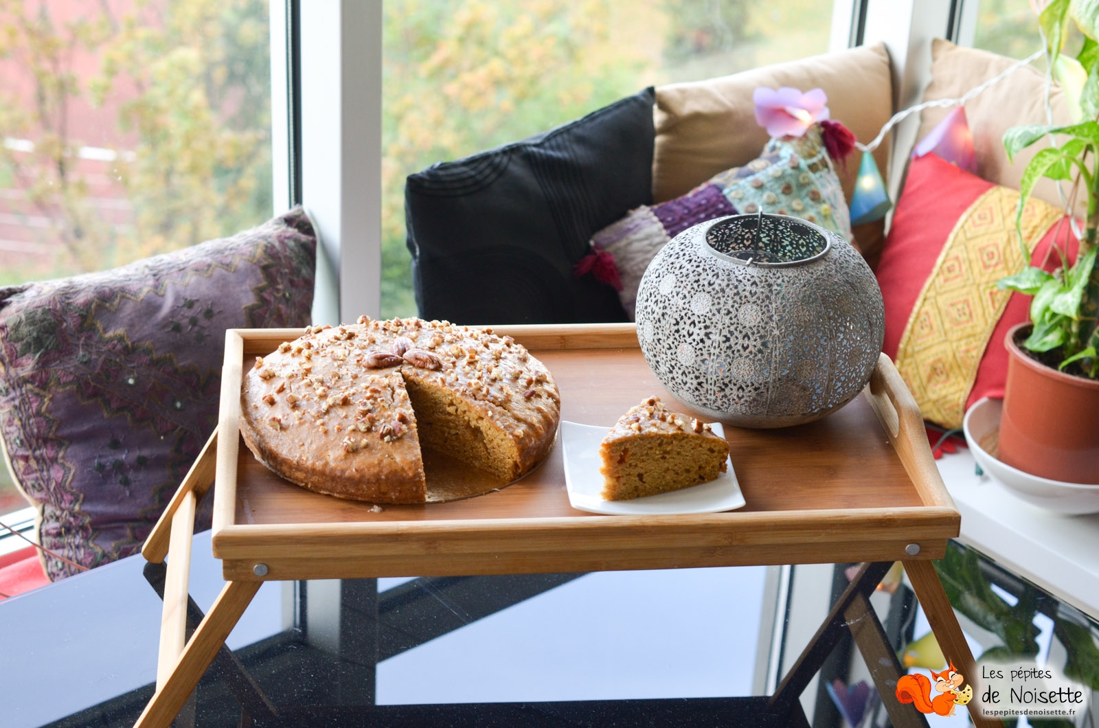 - A la sortie du four, laissez refroidir le cake 10 minutes avant de le démouler. Lorsqu’il est encore chaud ou tiède, imbiber le dessus du gâteau avec votre sirop tiède, à l’aide d’un pinceau. Saupoudrez de noix de pécan concassées et laissez totalement refroidir avant de déguster.