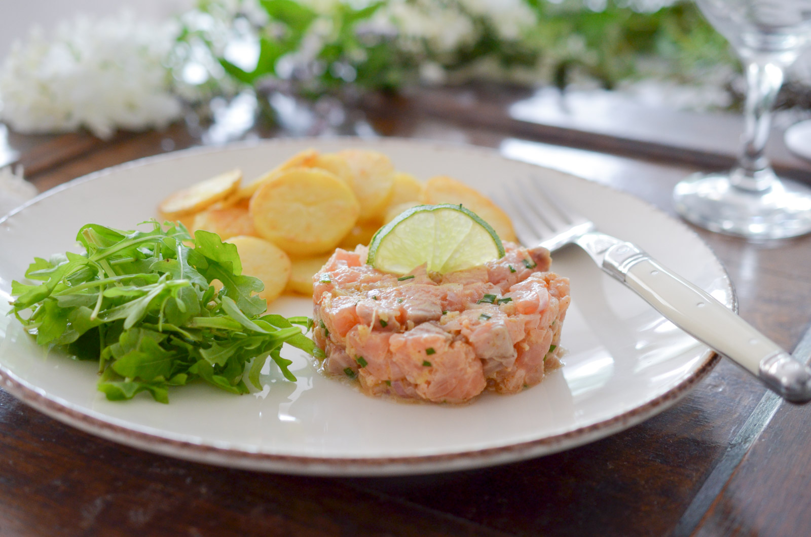 Le tartare de saumon c’est toujours bon et frais. J’ai voulu vous proposer ici une version « bistronomie », comme dans un bon bistrot à la cuisine élaborée (mais ne vous inquiétez pas la recette est très, très simple à faire). Un tartare servi avec des pommes de terre sautées, de la roquette, et surtout un tartare avec un assaisonnement original à base de gingembre, de citron vert et de curry.